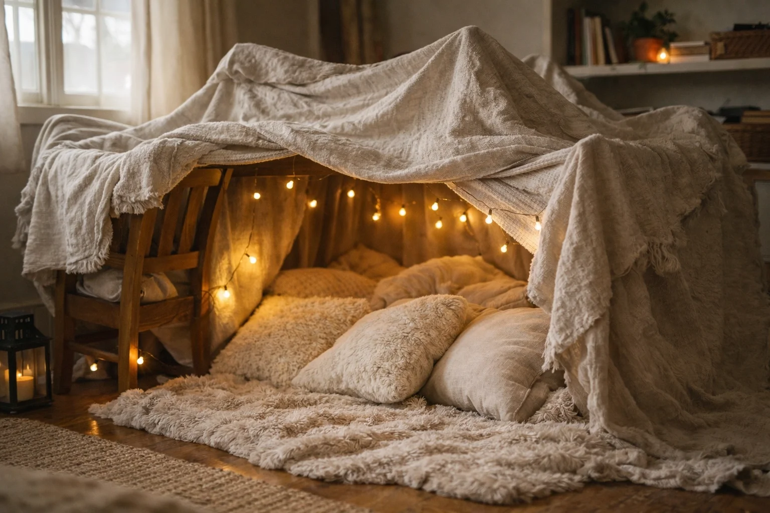 Find a corner of the living room, ideally near a window where you can still see the raindrops racing down the glass. Grab every green blanket, brown pillow, or "earthy" colored sheet you have. Drape them over a couple of chairs to make a tent or just pile them up on the floor to make a "mossy" mound.